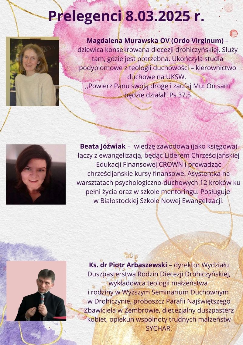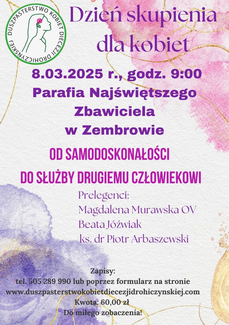 Podczas spotkania prelekcje wygłoszą: Magdalena Murawska OV, Beata Jóźwiak i ks. dr Piotr Arbaszewski.Diecezjalny Dzień Skupienia dla Kobiet odbędzie się w parafii pw. Najświętszego Zbawiciela w Zembrowie w sobotę, 8 marca. Początek o godz. 9.00. Organizatorem spotkania jest Duszpasterstwo Kobiet Diecezji Drohiczyńskiej.