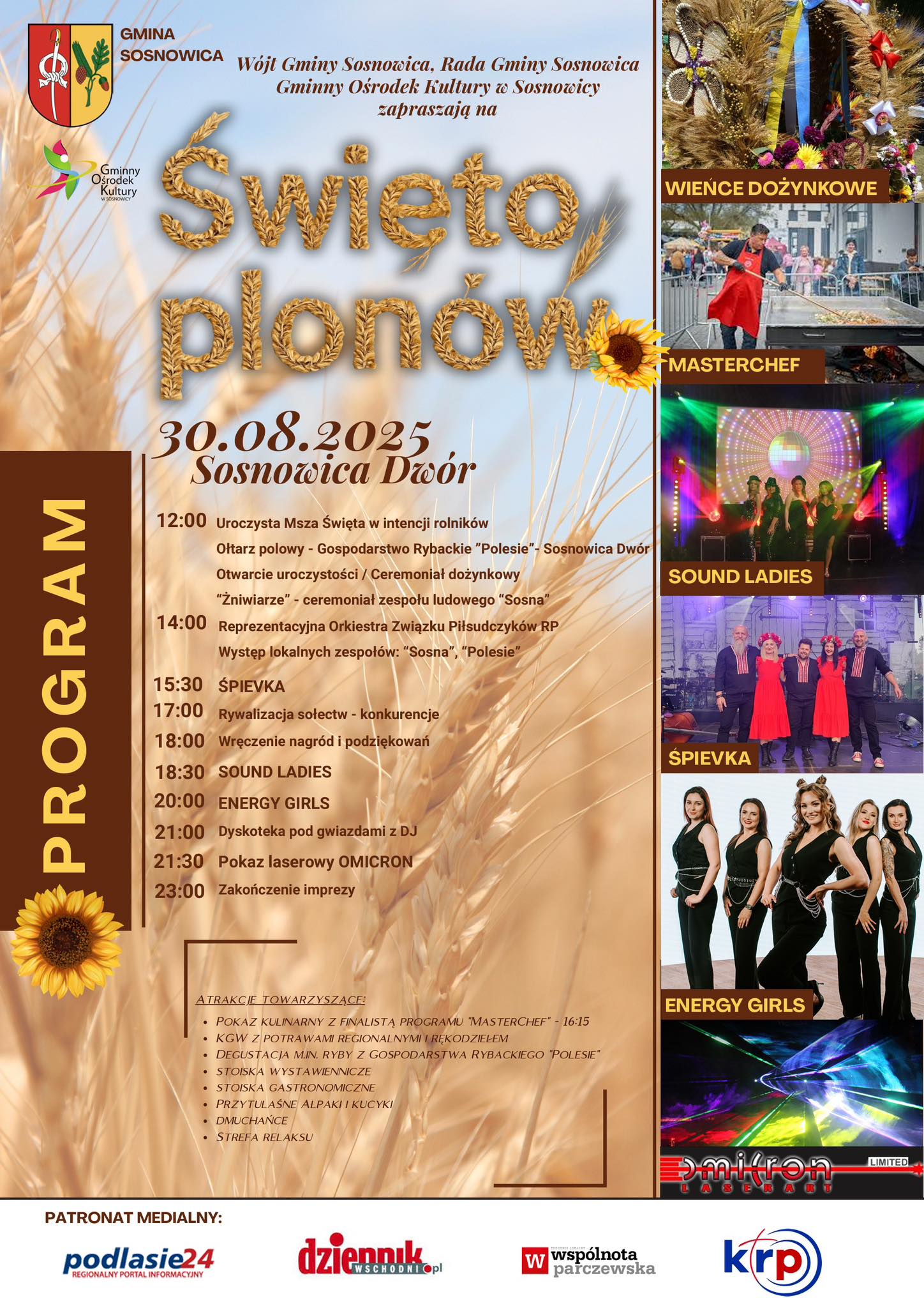 W sobotę, 30 sierpnia, Gmina Sosnowica zaprasza wszystkich mieszkańców do Gospodarstwa Rybackiego „Polesie”, gdzie odbędzie się Święto Plonów. Patronat medialny nad wydarzeniem sprawuje Katolickie Radio Podlasie oraz portal Podlasie24.pl.