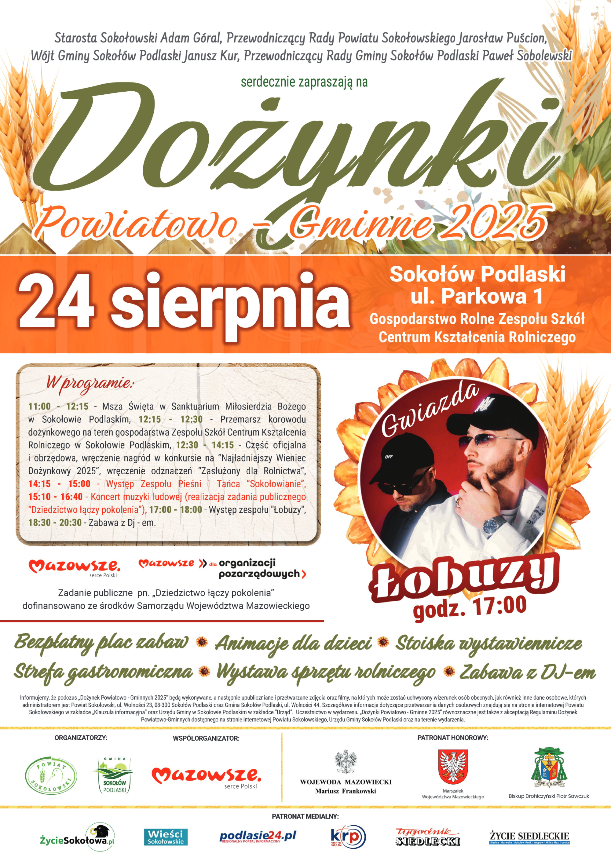 Po zakończeniu części oficjalnej i obrzędowej na dożynkowej scenie zaprezentują się artyści, a dzień zwieńczy występ gwiazdy Dożynek Powiatowo – Gminnych, którą jest zespół „Łobuzy” oraz wspólna zabawa taneczna, którą poprowadzi DJ Sebi.