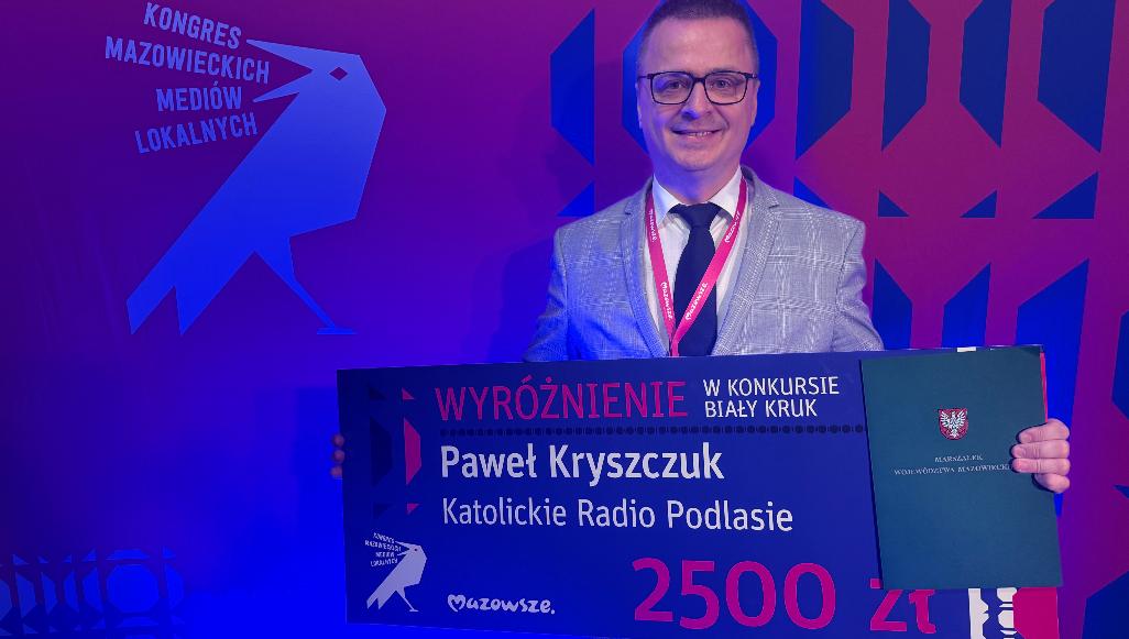 Najlepsi dziennikarze lokalnych i regionalnych mediów z Mazowsza zostali uhonorowani podczas gali wręczenia Nagród Marszałka Województwa Mazowieckiego „Biały Kruk”. Uroczystość była zwieńczeniem II Kongresu Mazowieckich Mediów Lokalnych, a wyróżnienia przyznano w dziesięciu kategoriach. W tegorocznej edycji konkursu o statuetkę „Białego Kruka” rywalizowało aż 137 prac dziennikarskich. Jury, w którego skład weszli wybitni przedstawiciele świata mediów i nauki, wyłoniło 13 laureatów oraz przyznało 28 wyróżnień. Autorzy najlepszych materiałów otrzymali pamiątkowe statuetki i nagrody finansowe. W kategorii „Materiał radiowy – reportaż” nagrodę otrzymał Paweł Kryszczuk z Katolickiego Radia Podlasie.