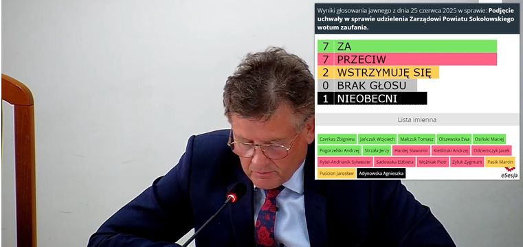 Rada Powiatu Sokołowskiego nie udzieliła wotum zaufania zarządowi powiatu. Za udzieleniem było siedmiu radnych, przeciw - również siedmiu, dwóch radnych wstrzymało się od głosu, jedna radna - Agnieszka Adynowska była nieobecna. Jednocześnie rada udzieliła zarządowi absolutorium za wykonanie budżetu za 2024 rok.