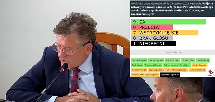 Jednocześnie Rada Powiatu Sokołowskiego udzieliła Zarządowi Powiatu sokołowskiego absolutorium z tytułu wykonania budżetu za 2024 rok. Za oddano 9 głosów, 7 osób wstrzymało się od głosu.