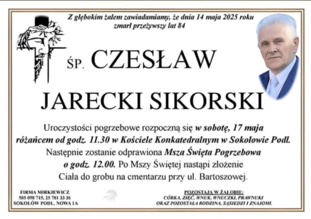 Msza żałobna rozpocznie się o godz. 12.00 w Kościele Konkatedranym w Sokołowie Podlaskim. Następnie ciało zmarłego spocznie na cmentarzu przy ul. Bartoszowej.Śp. Czesław Jarecki-Sikorski był absolwentem Technikum Rolniczego w Sokołowie Podlaskim (rocznik 1961), wieloletnim nauczycielem przedmiotów zawodowych w sokołowskim "Rolniku" oraz dyrektorem Zespołu Szkół Rolniczych im. Władysława Stanisława Reymonta w Sokołowie Podlaskim w latach 1989-2001.